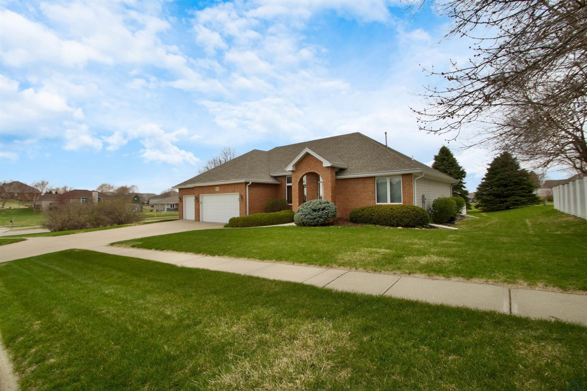 There is room for everyone in this spacious ranch home conveniently located near shopping and dining. Built by Lee Kent, this home sits on a .54-acre corner lot with mature trees and established landscaping. A welcoming first impression begins with the brick front, 3-car garage, and inviting front porch, leading into this 4-bedroom, 4-bathroom home. The entry (11x7) features wood flooring and a coat closet. A versatile room near the entry with wood flooring and crown molding offers flexible use as a formal living room, music room, office, or additional living space. The formal dining room includes a chandelier, carpet, and crown molding. The spacious eat-in kitchen features tile flooring, oak cabinets, an island, a 3x5 pantry, granite countertops, and a sliding door to the deck. Adjacent to the kitchen, the family room offers abundant natural light, a gas fireplace with brick surround, and built-ins. The home features a split-bedroom layout. The primary suite includes a carpeted bedroom with a tray ceiling, crown molding, and a sliding door to the deck. The en-suite bathroom offers tile flooring, a large double vanity, jetted tub, separate toilet and shower area, and a 6x10 walk-in closet. Two additional bedrooms include carpet, ceiling fans, and walk-in closets, with a full bathroom nearby featuring a large single vanity, tile floor, and tub/shower combination. Near the garage entry are a half bathroom and laundry area. The lower level includes a large family room with daylight windows, an additional bedroom with carpet, daylight window, and walk-in closet, a 3/4 bathroom, and a den with access to a spacious storage/mechanical area suitable for a workshop, craft, or fitness space. Updates include: water heater (2025), water softener (2025), refrigerator (2026), dishwasher (2020), shingles (2017), washer/dryer (2025), and HVAC/humidifier (2020). A radon mitigation system is in place.