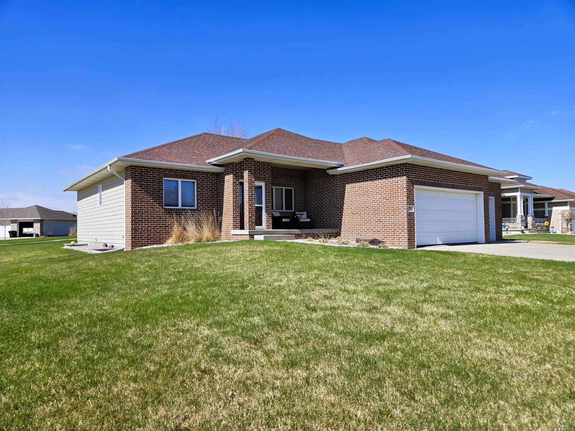 Beautiful custom built ranch home in Sergeant Bluff offering generous living space, thoughtful design, and quality finishes throughout. Built in 2009, this home features an inviting open main floor with a spacious living room highlighted by a tray ceiling and seamless flow into the dining area and updated kitchen. The kitchen was remodeled in 2019 and showcases attractive two-tone cabinetry, granite countertops, matching black appliances, a double sink, and a large island with seating. Just off the main living area, the sunroom creates a comfortable second gathering space and includes a fireplace. The master bedroom offers a private retreat with ensuite bath, separate soaking tub and shower, and a walk-in closet with extensive built-ins. Additional main floor bedrooms, guest bath, and main floor laundry enhance the homes functionality. The lower level expands the living space with 2 more bedrooms, a full bath, a large family room, open flex space, storm/tornado room, utility room, and abundant storage. A 3-stall attached garage with added storage and bonus workout area completes this well-planned home.
